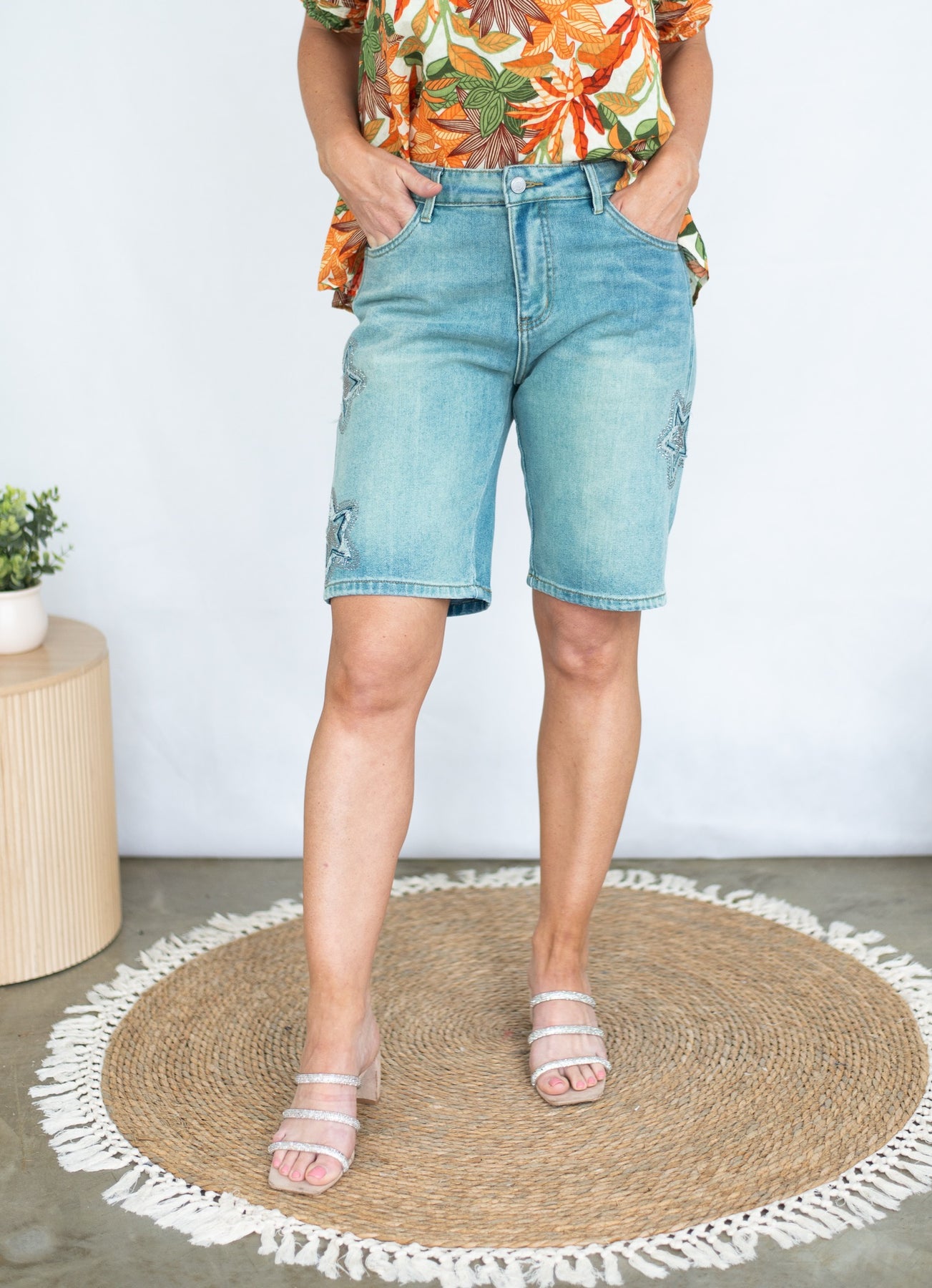The star of the show? Eye-catching rhinestone star patches that bring a fun, playful edge to a classic denim look. Whether you're heading out for a laid-back weekend, a festival, or simply want to elevate your basics, these shorts bring that extra touch of shine.