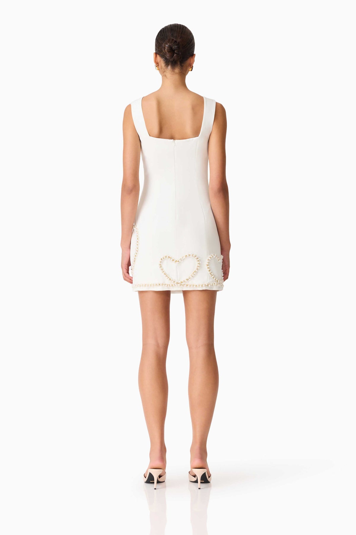 Sweet meets sophisticated in the Elliatt Nolana Mini Dress — a timeless silhouette elevated with playful detailing. Crafted from a structured suiting fabrication, this fitted mini features a clean straight neckline and wide straps for a modern, flattering finish. The standout pearl heart trim along the hem adds a romantic touch, making it a perfect bridal reception dress, ideal for the bride who wants something chic, fun, and effortlessly elegant.