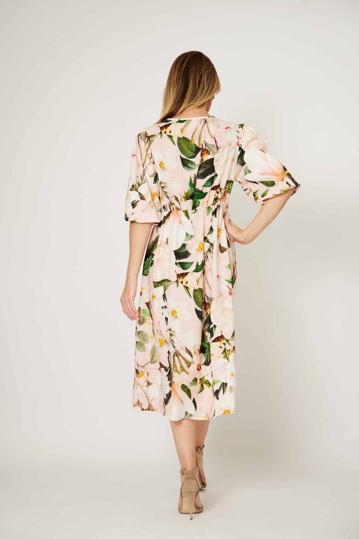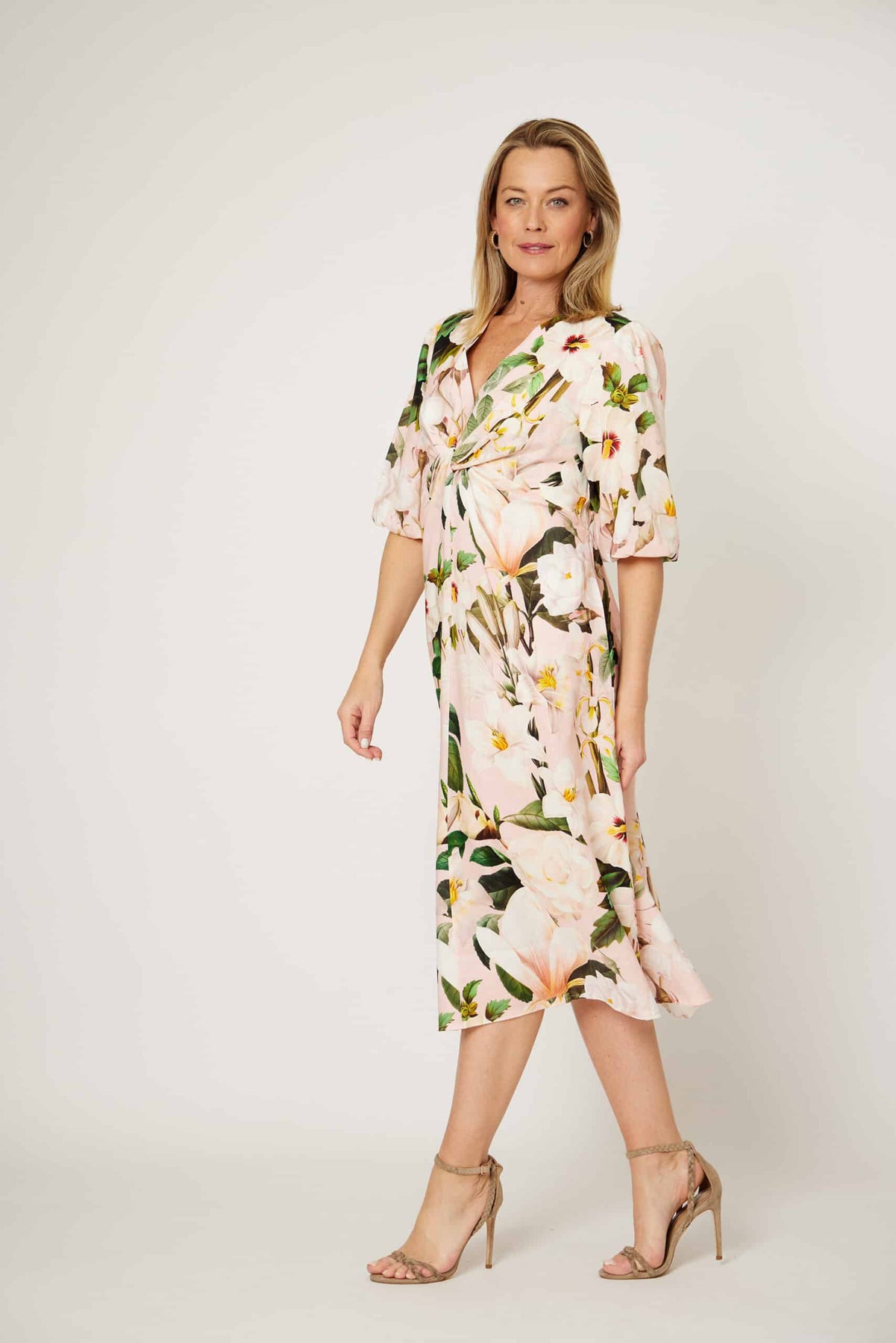 Expertly crafted with 100% Italian linen, this La Strada Knot Front Floral Dress features a flattering V neckline, adjustable puff sleeves, and an elastic waist for a comfortable fit. Complete with pockets for added convenience, it's perfect for any occasion.