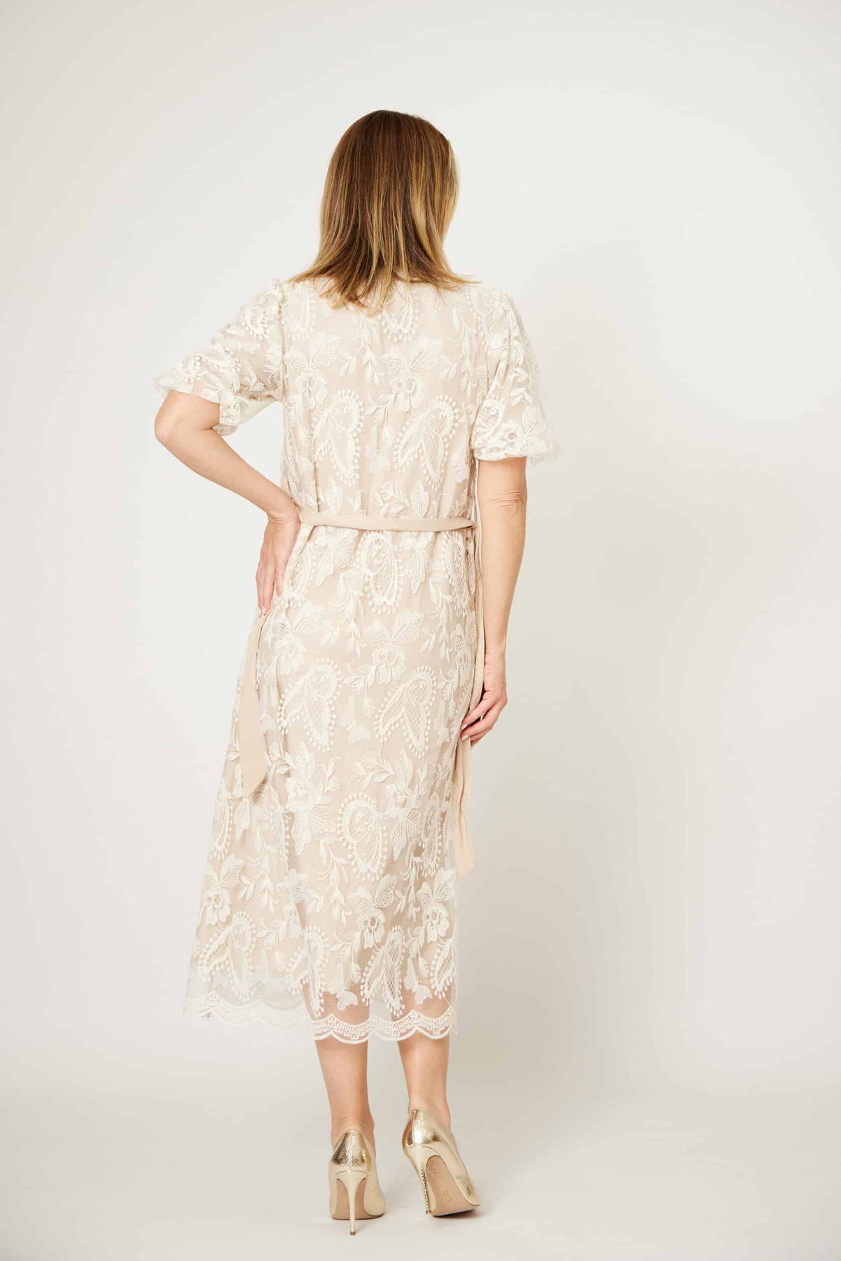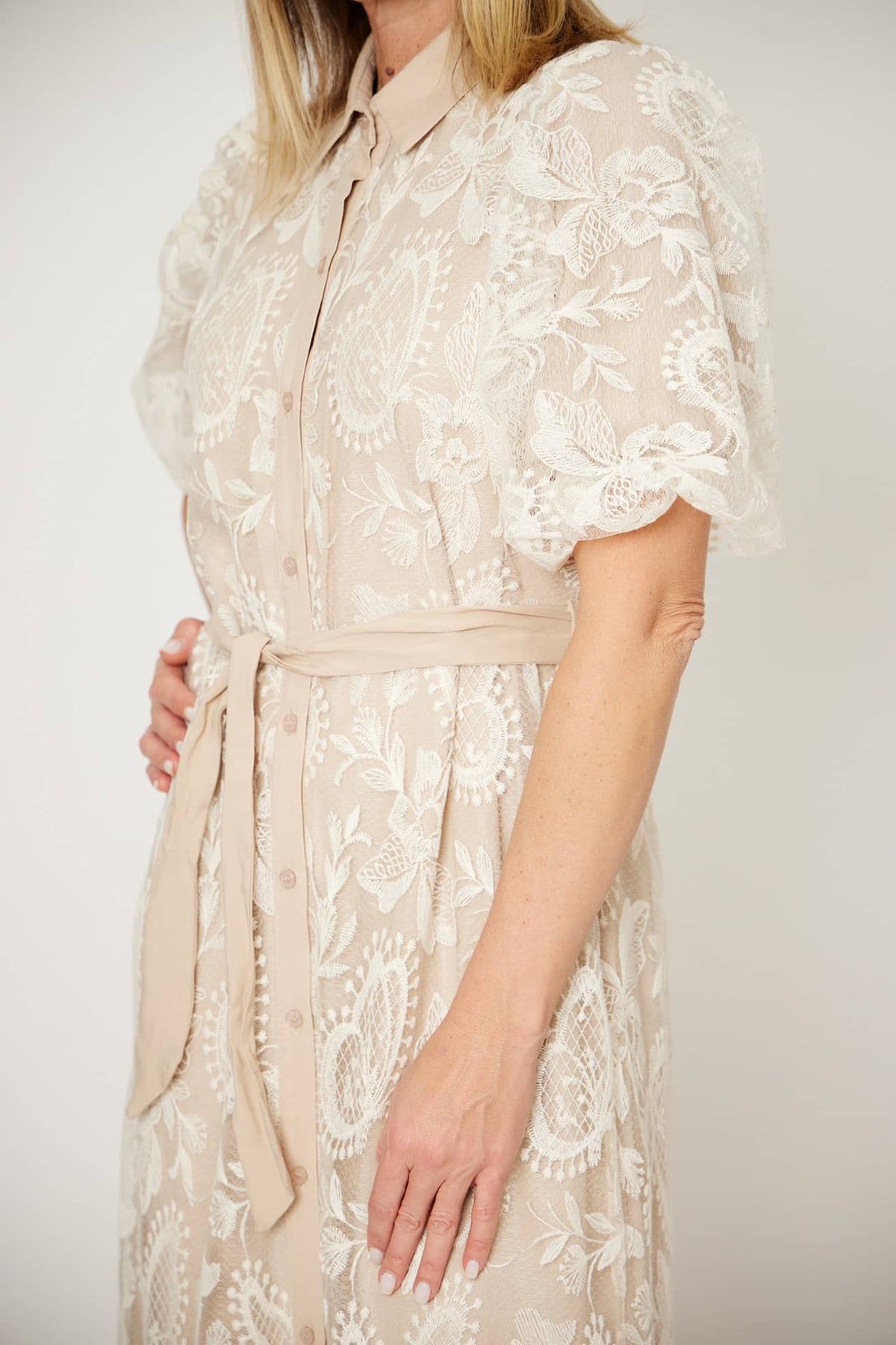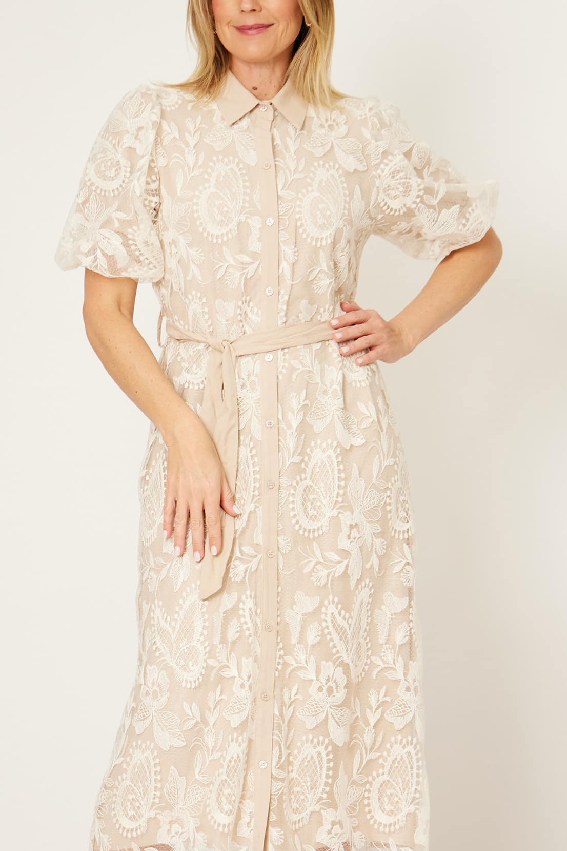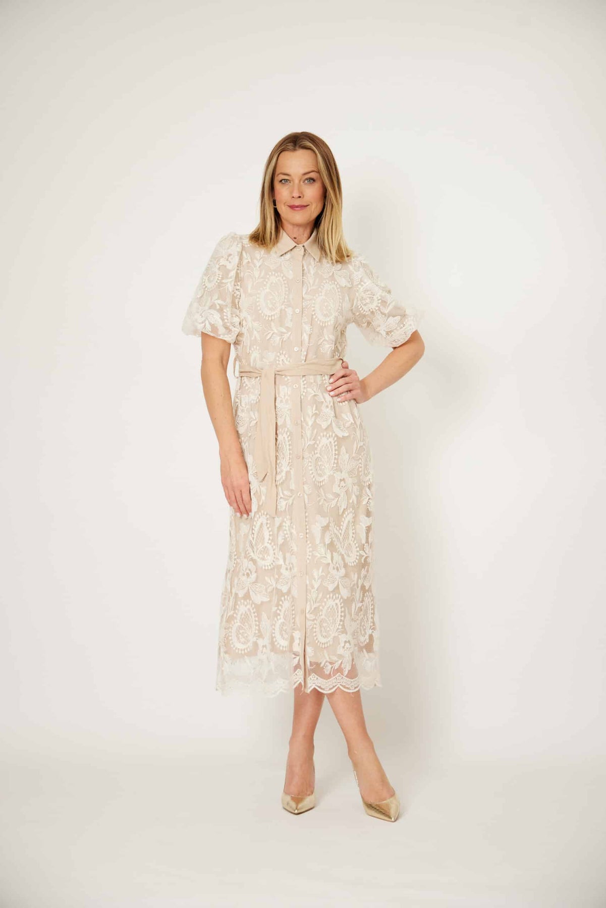 This La Strada Lace Shirt Dress is constructed with a 100% polyester outer and a 100% viscose lining, ensuring a lightweight and comfortable fit. The dress features beautiful embroidered lace details and comes with a belt for a flattering silhouette. Perfect for any occasion.