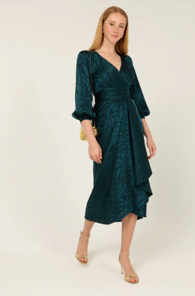 Featuring SACHA DRAKE’s iconic wrap design, the Michaela gently cinches the waist while pleats and delicate tucks create soft draping through the body for a flattering silhouette. The subtle hi–lo hemline adds fluid movement and modern elegance, falling to a refined midi length that works perfectly for weddings, race days, cocktail events and special occasions.