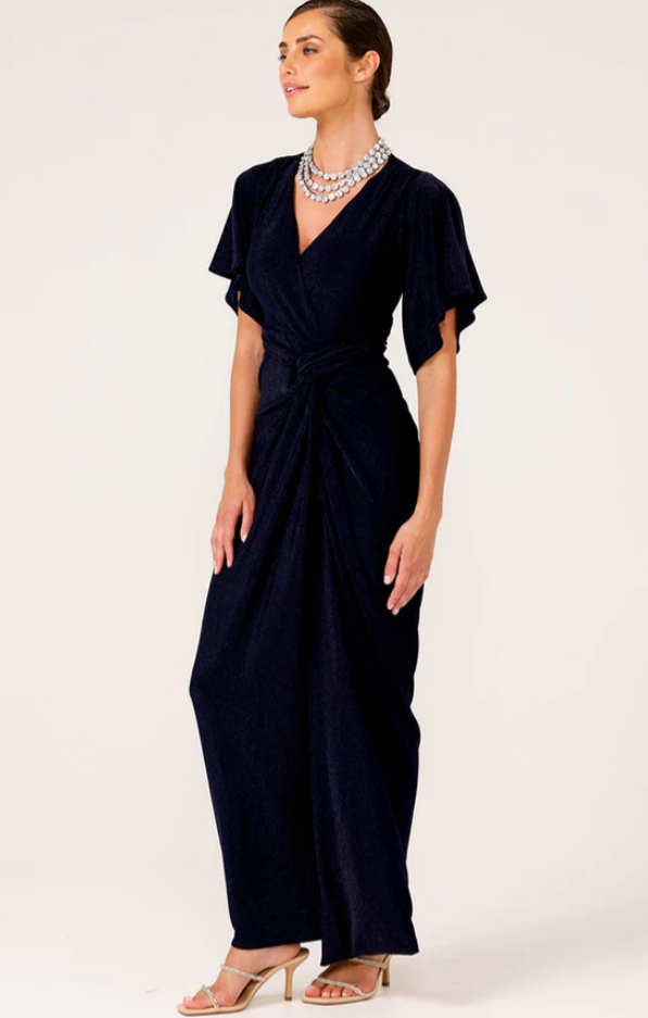 Elegant and alluring, the Emporium Maxi Dress is sure to bring out your inner diva! It's fitted style mixed with the stretch metallic lurex jersey fabric feels like a dream to wear and shows you off in all the right places. The knotted front adds flattering drape over the tummy and the fluted cap sleeve adds stylish coverage. Wear to cocktail events, gala dinners, weddings and any event where you want to shine.