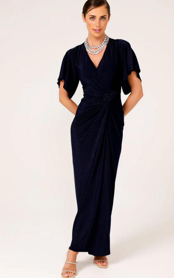 Elegant and alluring, the Emporium Maxi Dress is sure to bring out your inner diva! It's fitted style mixed with the stretch metallic lurex jersey fabric feels like a dream to wear and shows you off in all the right places. The knotted front adds flattering drape over the tummy and the fluted cap sleeve adds stylish coverage. Wear to cocktail events, gala dinners, weddings and any event where you want to shine.