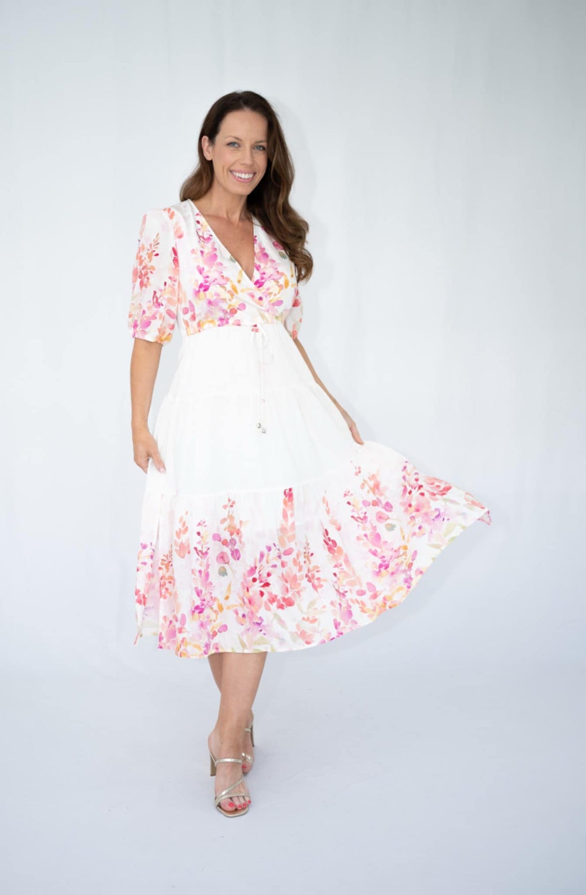The Fria Blossom Border Mock Wrap Midi Dress combines an elastic short sleeve design with a faux wrap bodice for effortless style and comfort. Its drawstring waist allows for a customizable fit, while the tiered skirt adds movement and dimension, delivering a refined yet relaxed silhouette ideal for various occasions.