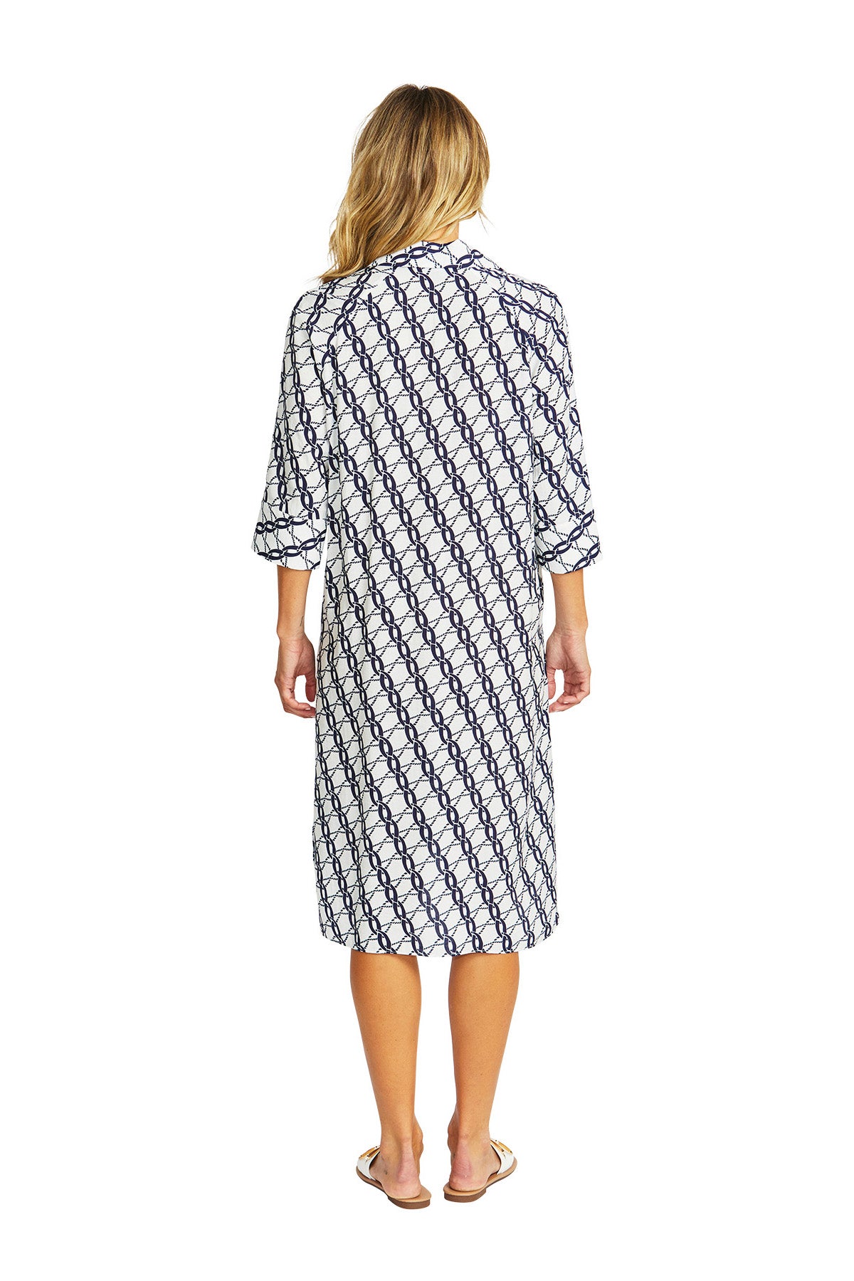 Expertly crafted from a viscose blend fabric, the Ping Pong Chain Shirt Dress features a stylish collar and convenient button through front. With 3/4 sleeves and a midi length, this dress offers both comfort and sophistication. Plus, it's finished with practical pockets for added functionality.