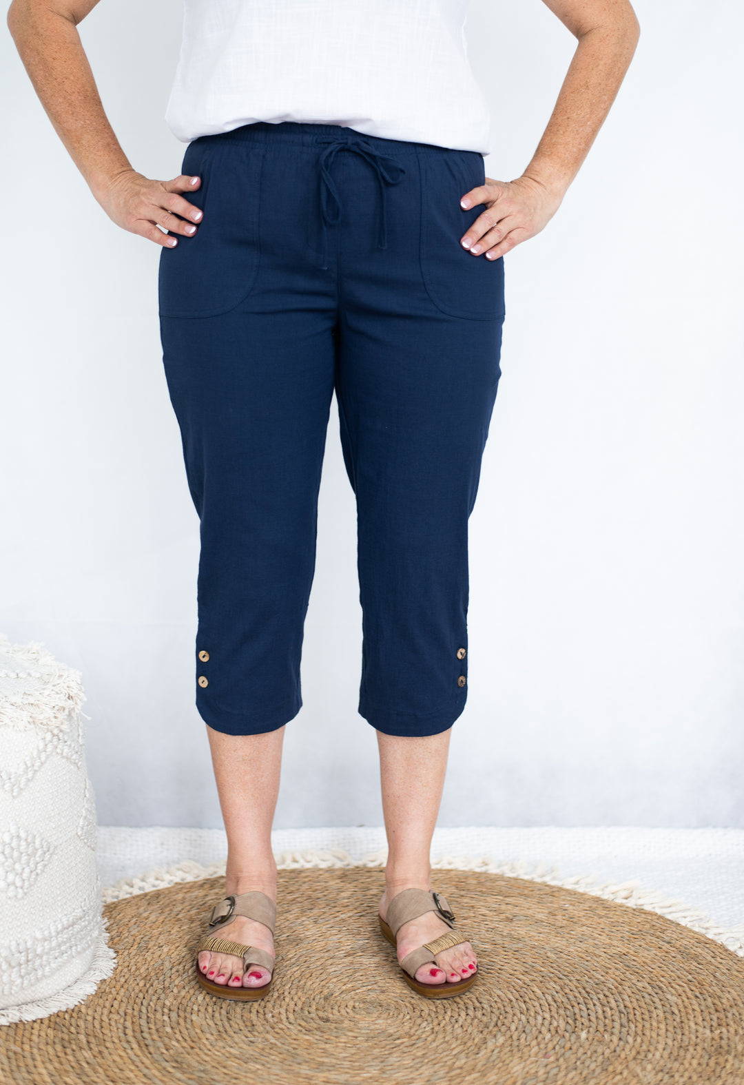 Willow Tree Button Detail Stretch Capri Pant in Navy