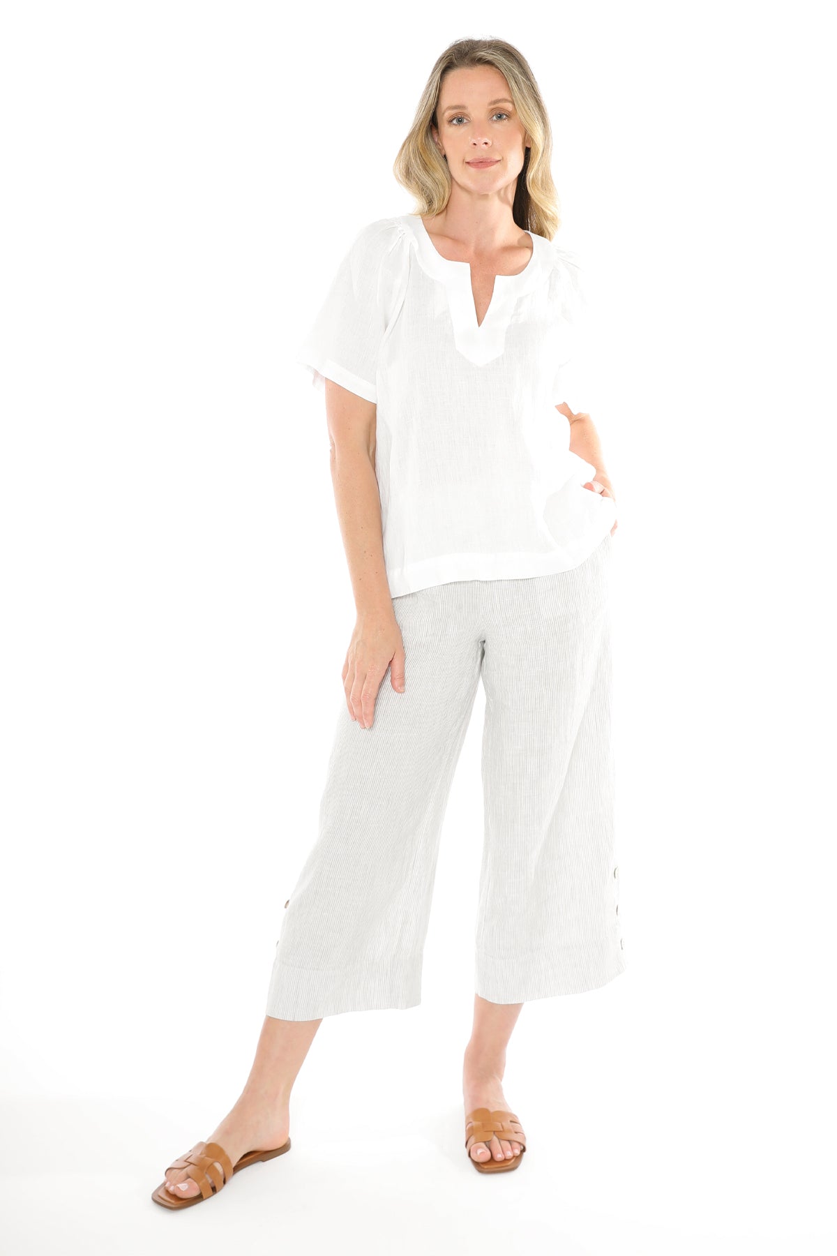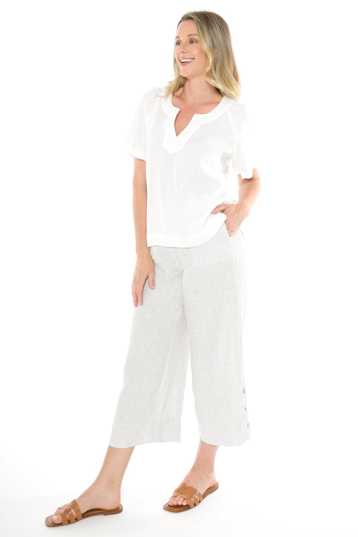 Jump V Neckline Short Sleeve Linen Top in White