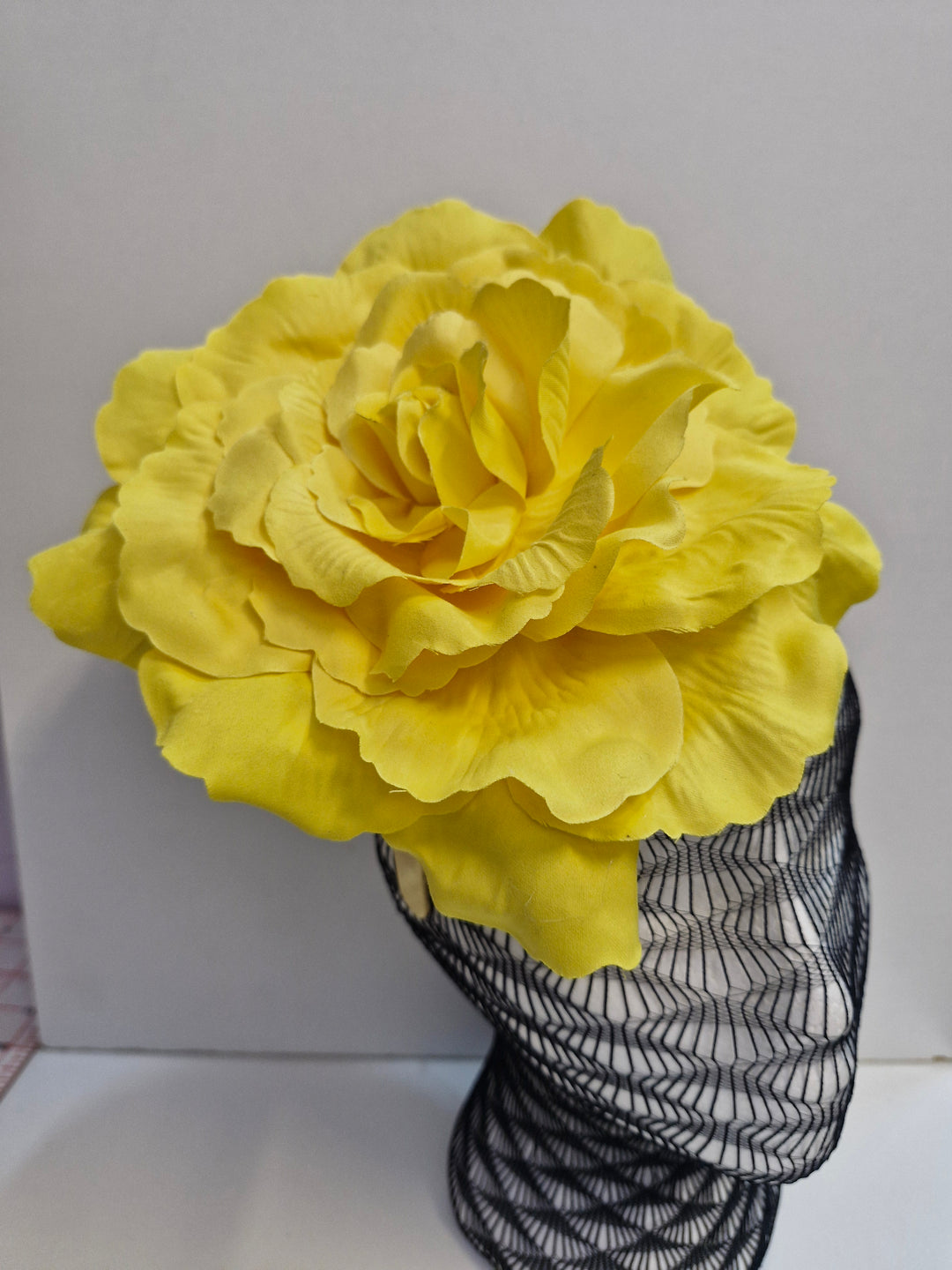 MC Millinery MC1173 Lemon teardrop button with magenta bow and cobweb lace overlay
