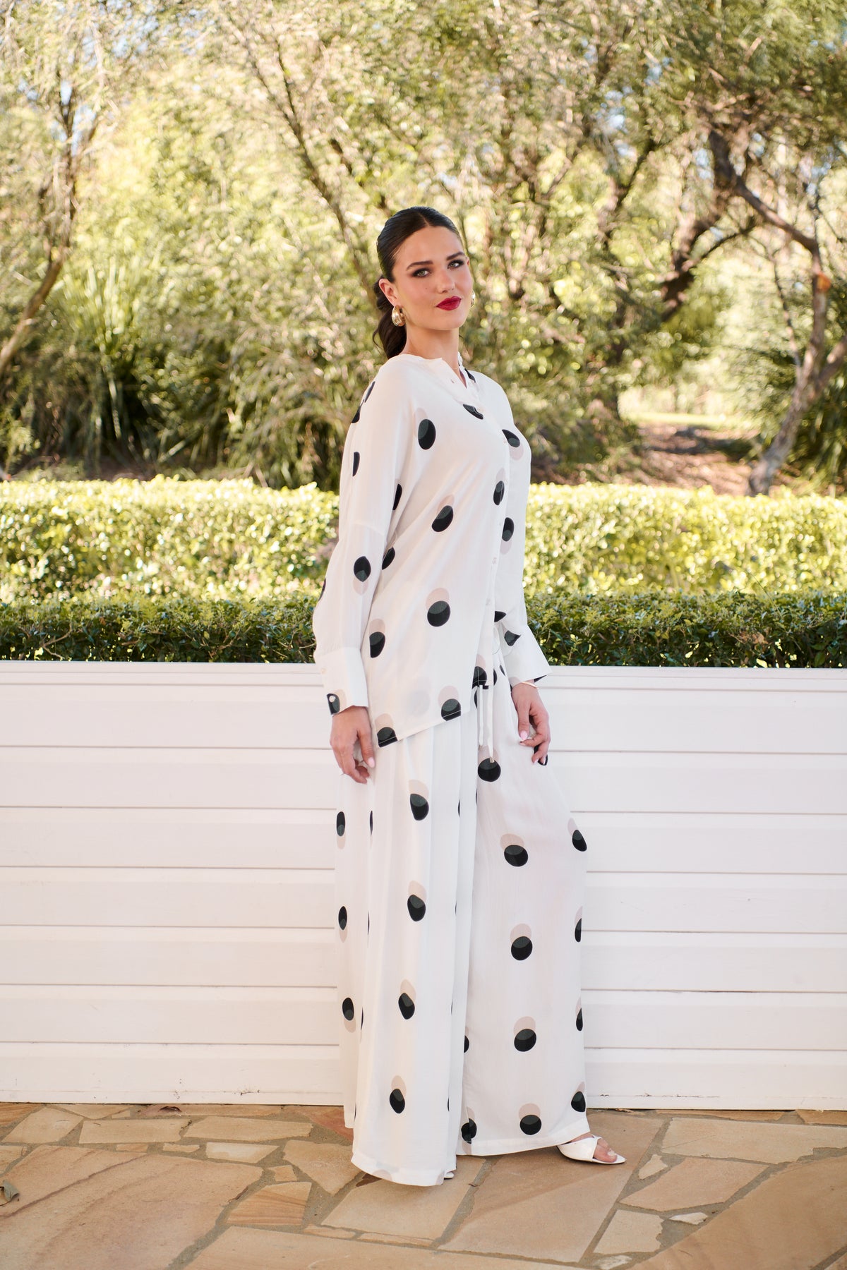 Designed in Collectivo’s signature two-tone polka dot print on an ivory base, the Julia Pant brings a playful yet refined aesthetic to your wardrobe. The elasticised drawstring waist ensures an easy, adjustable fit, while the full-length wide leg creates a striking silhouette that elongates the body.